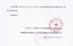本項目截止2021年2月18日17時00分前,繳納投標保證金家數(shù)未滿三家,故作流標處理。特此通知!采購人:雅安市名山區(qū)茶城建設工程有限公司采購招標代理機構:四川省中遂建設項目管理有限公司日期:2021年2月20日...