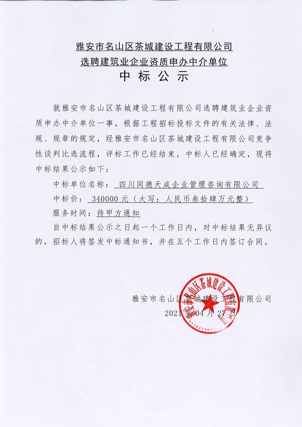 選聘建筑企業(yè)資質申辦中介單位中標公示